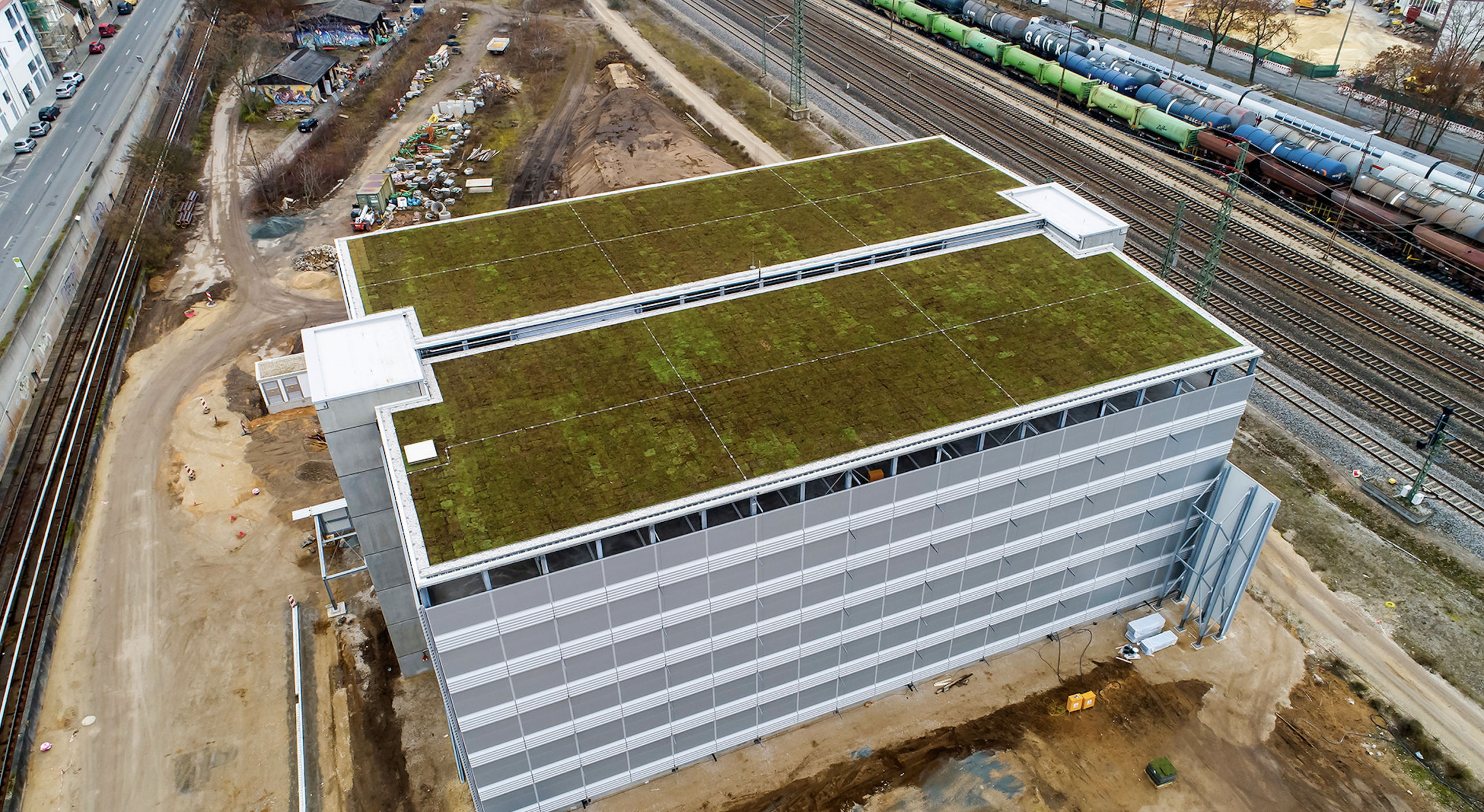 MobiRoof is een systeem van voorgekweekte Sedumcassettes die een snelle en eenvoudige montage garanderen. De vergroening van het hele dak duurde slechts drie dagen. Het aanbrengen van een drainagelaag was niet nodig. Het cassettesysteem wordt gebruiksklaar opgeleverd: beplant met een Sedummix en voorzien van een speciaal substraat voor drainage en waterberging. “Naast de vele productvoordelen is een zeer doorslaggevend argument voor een groen dak zonder twijfel dat de dakvegetatie duidelijk bijdraagt aan een verbetering van de luchtkwaliteit. De CO2 wordt gereduceerd en de fijne stofdeeltjes worden gebonden – dit is onmisbaar in binnenstedelijke gebieden,” zegt de constructiemanager van de Max Bögl Group. Interessant is ook dat veel steden en gemeenten subsidies verlenen voor groene daken.