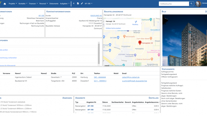 Het mobiele projectcentrum is vormgegeven als een persoonlijk dashboard en biedt toegang tot alle informatie over een project. “Met het taakbeheer is het mogelijk om op elk moment in contact te blijven met alle medewerkers, taken toe te wijzen en altijd een totaaloverzicht te houden van de actuele status van een project,” legt Boley uit. “Alle documenten die in E·R·Plus beschikbaar zijn, kunnen online worden opgevraagd door middel van de tekst- en documentzoekfunctie. Het contactcenter biedt op zijn beurt CRM-functionaliteiten. Hierin kunnen nieuwe contacten worden aangemaakt of bestaande contacten worden opgeroepen met alle beschikbare informatie. Daarnaast zijn de personeelsplanner en de afwezigheid van personeel op elk moment in te zien en overal te gebruiken.”
