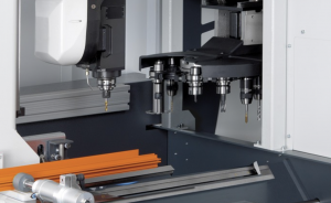 De SBZ 122/75 is een 5-assige profielbewerkingsmachine en de kleine broer van de grote 5-assige machine SBZ 151 “De ‘compacte’ machine is nu sinds twee jaar op de markt en is uitermate geschikt voor stukproductie,” zegt Vincent Vandevelde van elumatec. “Ondanks het compacte formaat is de SBZ 122/75 een echte allrounder: boren, frezen, tappen, zagen, … hij kan het allemaal, ook nog eens vanuit vijf zijden. Dat is echt uniek voor deze klasse waarin de machine is gepositioneerd. Meestal ontbreekt minimaal één van deze functie bij concurrerende machines. Het feit dat alle bewerkingen volledig in een gesloten cabine plaatsvinden, garandeert een hoge mate van veiligheid.” Koen vult aan: “Dankzij de nieuwe machine wisten we onze doorlooptijd te verkorten van 35 minuten naar 9 minuten per handgreep. Frezen en draadtappen gaat veel sneller. Alles wordt bovendien geprogrammeerd via parameters en bewerkingsgroepen wat zorgt voor een minimum aan voorbereiding en omsteltijden ten opzichte van onze oude freesmachine.”