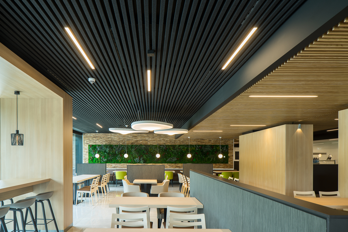Vilt is geen onbekend product in de akoestische wereld. Hunter Douglas presenteert echter met HeartFelt het eerste geavanceerde vilten plafond- en wandsysteem ter wereld. “Vilt is een prachtig materiaal om de akoestiek in elke ruimte nauwgezet te regisseren,” zegt Terry. “De lineaire vilten panelen zijn box-vormig en voldoen vanzelfsprekend aan het Bouwbesluit qua brandveiligheid. De panelen zijn 100% recyclebaar, evenals de dragers en hangers uit respectievelijk aluminium en gegalvaniseerd staal, C2C brons gecertificeerd. De panelen zijn leverbaar in zeven grijstinten en vijf aardetinten. Het biedt architecten de gelegenheid om verrassende patronen te creëren, te meer daar ook gespeeld kan worden met de diepte. De panelen zijn namelijk leverbaar in hoogtes van 55, 85 en 105 millimeter. Door ook nog te variëren met de afstanden tussen de panelen, ontstaat een mooi speels effect. Het bezorgt de ruimte een warme en huiselijke uitstraling.”