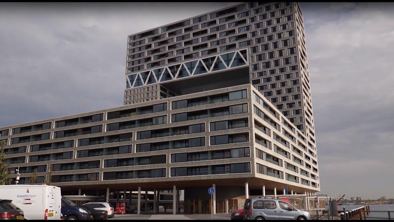 Waar vroeger de vrachtschepen hun boomstammen losten, wordt momenteel hard gewerkt aan een groene eilandenwijk. Een fraaie plek, waar Amsterdammers ruim kunnen wonen aan het water. Het 90 meter hoge gebouw wordt een nieuw ‘landmark’, dat prima past bij de serie iconische gebouwen aan het IJ.