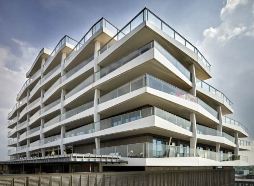De toepassing van glasvezelversterkt polyester in de gevel geeft architecten een hoge mate van vormvrijheid. Vrijwel alle (3D-)vormen zijn wel te realiseren. “We kunnen een uitstraling creëren die onmogelijk met andere materialen is te bereiken,” vervolgt Werner. “Onze elementen zijn veel dunner en sterker dan beton en in vergelijking met metalen cassettes of panelen kunnen we bovendien veel eleganter omgaan met allerlei exotische vormen. Het aantal naden is tot een minimum beperkt en met een oordeelkundige detaillering nauwelijks zichtbaar. Dat maakt dat de gevelbekleding optisch over een gebouw heen gedrapeerd lijkt te zijn en ‘aus einem Guss’ wordt ervaren.” Glasvezelversterkt polyester heeft misschien een ietwat negatieve connotatie, maar is volgens Werner zeker niet meer vervuilend dan andere gangbare materialen. “Integendeel. Natuurlijk, het is een aardolieproduct, maar de inzet van de grondstof is uiterst efficiënt. Het aandeel is heel gering en staat niet in verhouding tot andere materialen. Op termijn zijn er bovendien mogelijkheden om het materiaal op een goede manier te recyclen of downcyclen.”