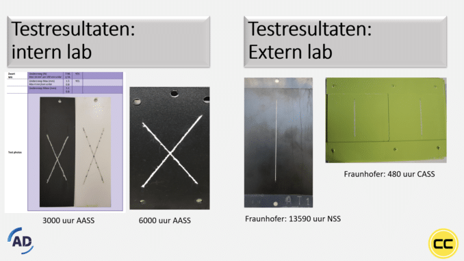 Als je de hele keten bekijkt van hoe een gelakt aluminium product tot stand komt, dan heb je het over aluminiumlegeringen, het ontwerp van constructies, de voorbehandeling, poederlakken, poederfabrikanten, enz. “Elke schakel heeft een rol in de keten”, vindt Appels. Neemt niet weg dat er steeds meer gerecycleerd aluminium op de markt komt onder impuls van duurzaamheid, circulaire economie, ecologische voetafdruk etc. “Kenmerkend voor dit type aluminium ten opzichte van primair aluminium is dat er vaak verhoogde waardes zink (Zn) en koper (Cu) aanwezig zijn, hoewel het dan nog steeds aan de legeringsnorm voldoet”, legt Roland van Meer uit, sales director bij AD Chemicals. Sinds de intrede van gerecycled aluminium constateert men bij de keuringlaboratoria (bijv. Qualicoat-keuringen) een toename van slechte corrosietesten (zoutsproeitest en FFC-test). Reden voor AD Chemicals en Compri Coating Services om de proef op de som te nemen.