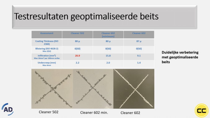 De uitkomsten van deze test (na 1.000 uur AAST) zijn in een overzicht te zien in afbeelding 3. Hieruit blijkt dat met Cleaner 502, de reguliere beits van AD Chemicals net boven de norm wordt gepresteerd. Met de eerste optimalisatie stap (Cleaner 602 min.) ziet men al een duidelijke verbetering en met het volledige geoptimaliseerde product (Cleaner 602) wordt een perfect resultaat behaald.