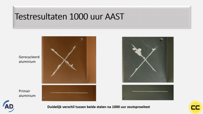 De afbeelding hierboven geeft de resultaten na 1.000 uur zoutsproeitest (AAST) weer, waarbij duidelijk te zien is dat gerecycled aluminium een minder resultaat geeft. Dit onderzoek toont aan dat niet uitsluitend de concentratie aan koper en zink van doorslaggevende aard is, maar eerder ook de verhouding tot elkaar. Wanneer deze beide elementen samen in verhouding van 1 : 1 aanwezig zijn in de legering blijft de corrosiewering goed. Wanneer deze verhouding uit verband is, dan zijn de resultaten van een zoutsproeitest aanmerkelijk minder. Dit wordt inmiddels ook bevestigd vanuit de wetenschap.
