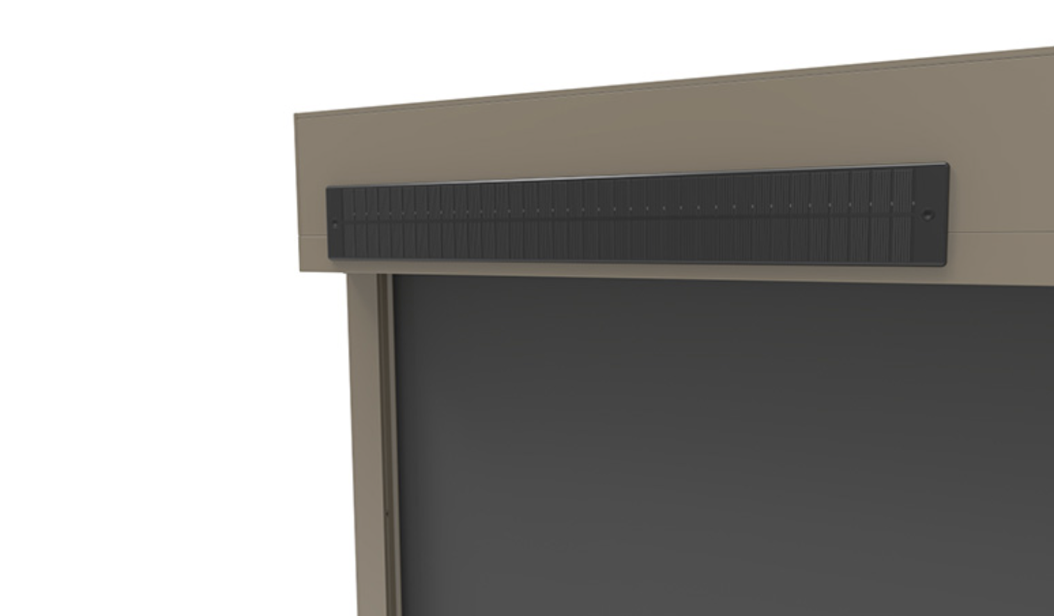 De compacte zonnecel kan naar keuze links of rechts op de kast geplaatst worden. De screen wordt standaard geleverd met een radiogestuurde motor en de batterij bevindt zich in een kokerprofiel onder de kast. Zowel motor als batterij zijn eenvoudig bereikbaar. Dynamische doekzonwering als deze zorgt trouwens niet alleen voor aangename binnentemperaturen in de zomer, maar laat tegelijk ook toe om in de winter toch optimaal te blijven besparen op stookkosten dankzij de binnenvallende zon.