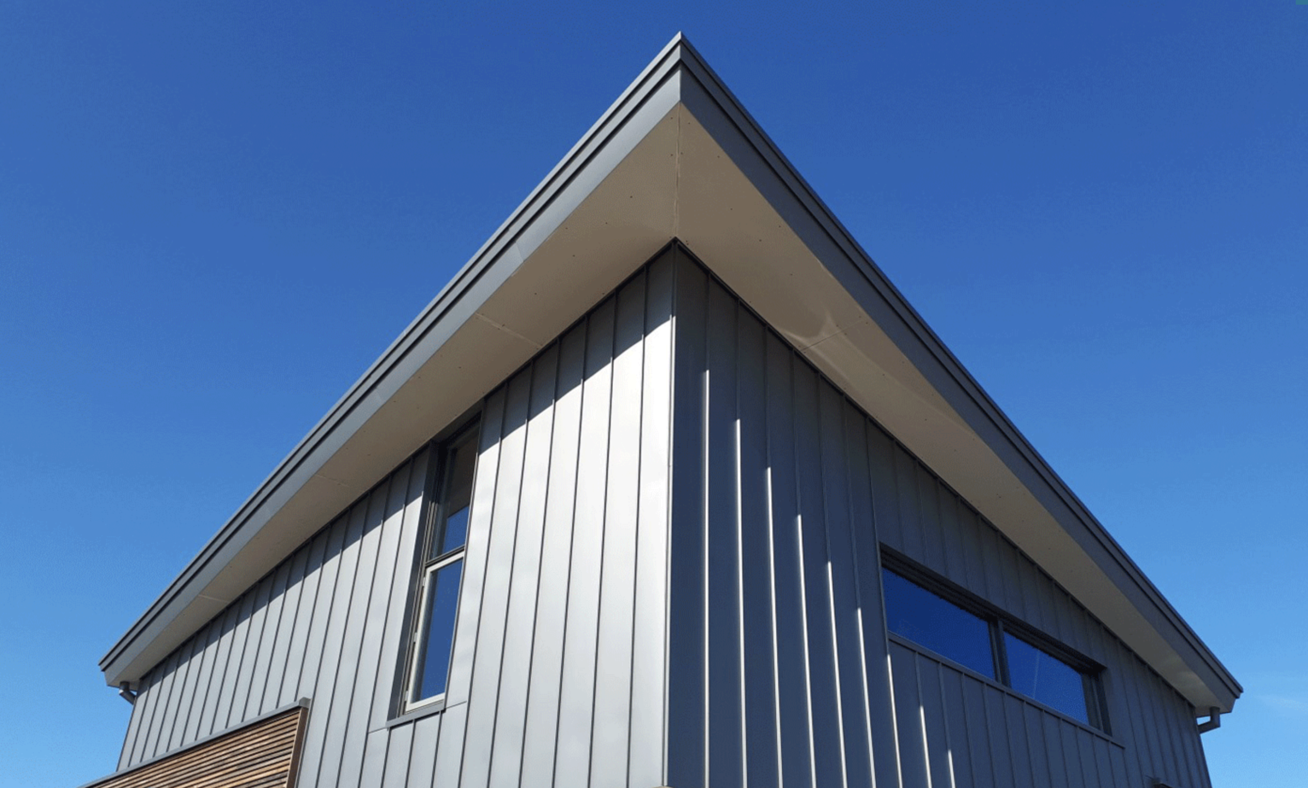 Eigenlijk is het een rechte opbouw met een aparte uitstraling door de vorm: een triangel op een schoenendoos. Tegen de gevel en op het dak heeft Ridder Skins for Buildings in ruim een maand 400 m2 NedZink NOVA verwerkt op een geventileerde onderconstructie met een dampopen waterkerende folie.
