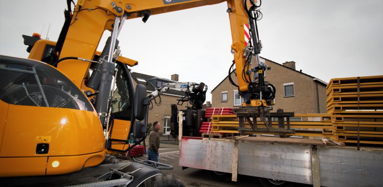 Ondanks dat de transportwagen voorzien is van een kraan en stenengrijper, lost Maarten liever zelf met zijn mobiele graafmachine. Dan ligt het materiaal snel en veilig op de goede plek en kan de vrachtwagen ook weer snel doorrijden. Géén tijdverlies, géén dubbel werk en minder overlast voor de omwonende, zo zien wij het graag Maarten!