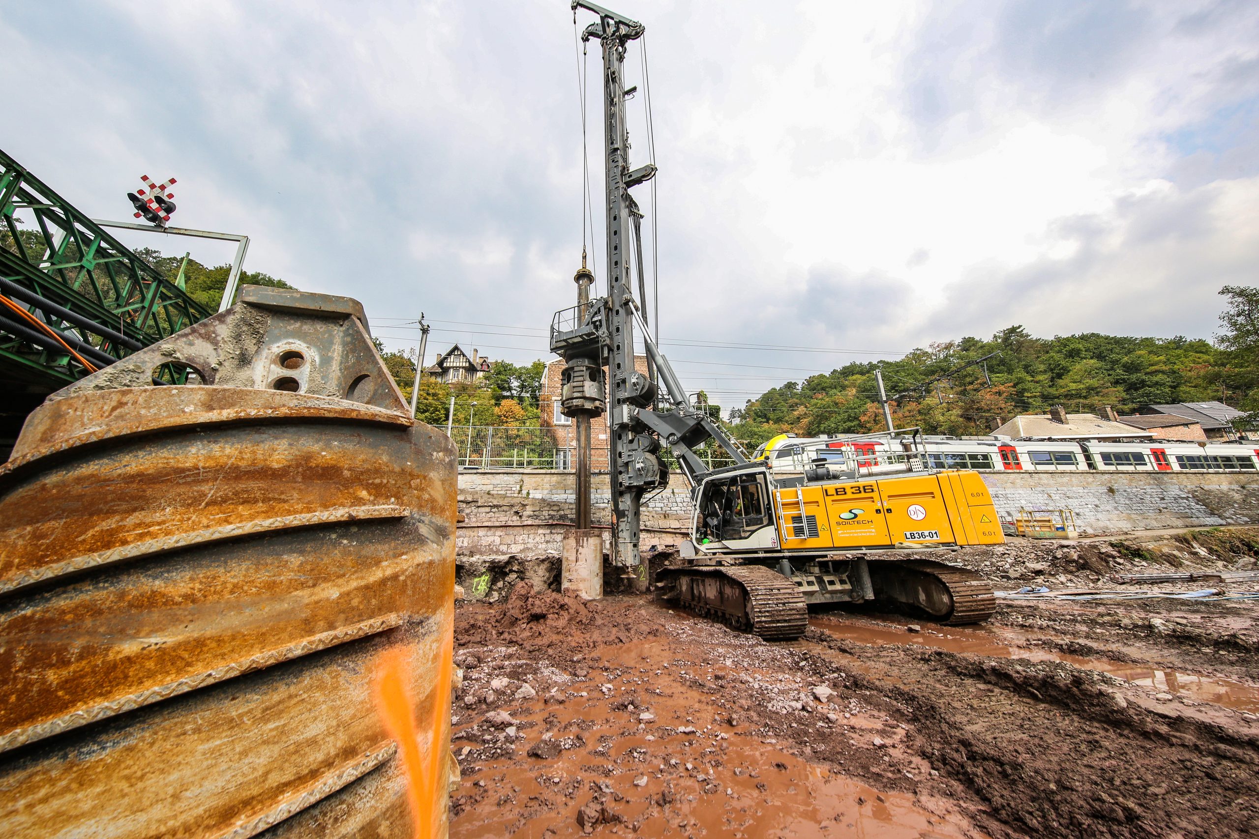 Jaarlijks wordt Soetaert betrokken bij een 200-tal projecten. Beyts pikt er een tweetal uit. “Op de voormalige site van Post X in Antwerpen wordt het nieuwe Mastergebouw LPA gebouwd. Een heel prestigieus en complex gebouw met een indrukwekkende diepwandwerf: diepwandpanelen werden tot op een maximale diepte van 33 meter geplaatst. Daarnaast voorzagen we tijdens de uitgraving van de bouwput (tot – 17m) twee ankerrijen. Geen sinecure! Zeker als je weet dat we op tal van obstakels stootten (oude funderingen en de bakstenen omwalling uit de 19e eeuw) en we aan het werk waren dicht bij bestaande en in opbouw zijnde gebouwen.” Een ander aansprekend project is de nieuwe brug over de Ourthe. “Met onze grote makelaarsgeleide machine Liebherr LB36 realiseren wij daar in totaal een 45-tal kellypalen (diameter 1300mm), zowel permanente als tijdelijke palen. De acht tijdelijke palen blijven staan tijdens de montage van de brug, maar worden nadien verwijderd.”