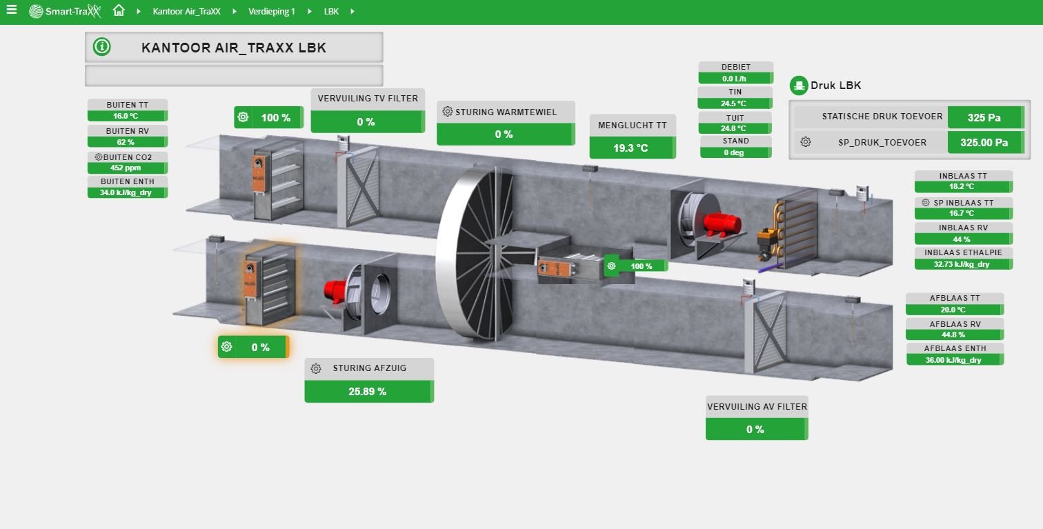 Behalve het ontwerpen en realiseren van meet- en regelsystemen voor gebouwgebonden installaties is Air-Traxx ook leverancier van oplossingsgerichte ventilatieproducten met geïntegreerde meet- en regeltechniek. “Onze kracht is het bieden van complete oplossingen, van thermostaat tot geavanceerde gebouwbeheersysteem, maar ook van luchtbehandelingskasten tot inblaasroosters,” verduidelijkt Smit. “We zijn voornamelijk actief in de utiliteit, van kleine kantoren tot grote distributiecentra. Behalve in Nederland is ons concept ook opgemerkt in China, waar we momenteel grote kantoorparken tot wel 400.000 m2(!) voorzien van intelligentie.”