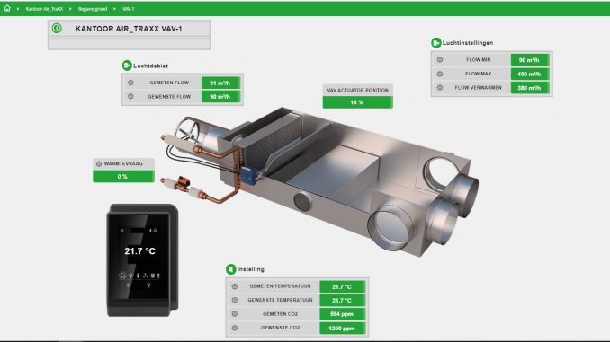 Air-TraXX is al jaren een van de specialisten op het gebied van complete VAV inductiesystemen voor verwarmen en koelen met lucht. “We hebben het concept zodanig ontwikkeld dat we het stekerklaar kunnen aanbieden aan de markt, zodat het eenvoudig geïnstalleerd kan worden,” legt Smit uit. “De ventilatie wordt geregeld op basis van de behoefte en parameters zoals ruimtetemperatuur en/of CO2. Alle regelaars communiceren via het IP-netwerk en worden per verdieping op één punt verzameld in een netwerkswitch, bij voorkeur in de schacht. Van hieruit wordt de verbinding gemaakt met de backbone, een embedded Linux pc waarop het gebouwbeheersysteem draait. Het concept hebben we in China reeds op grote schaal toegepast. Het is door ons volledig uitontwikkeld en op locatie is het een kwestie van plug-and-play. Door het concept hebben we minder de handjes nodig op locatie.”