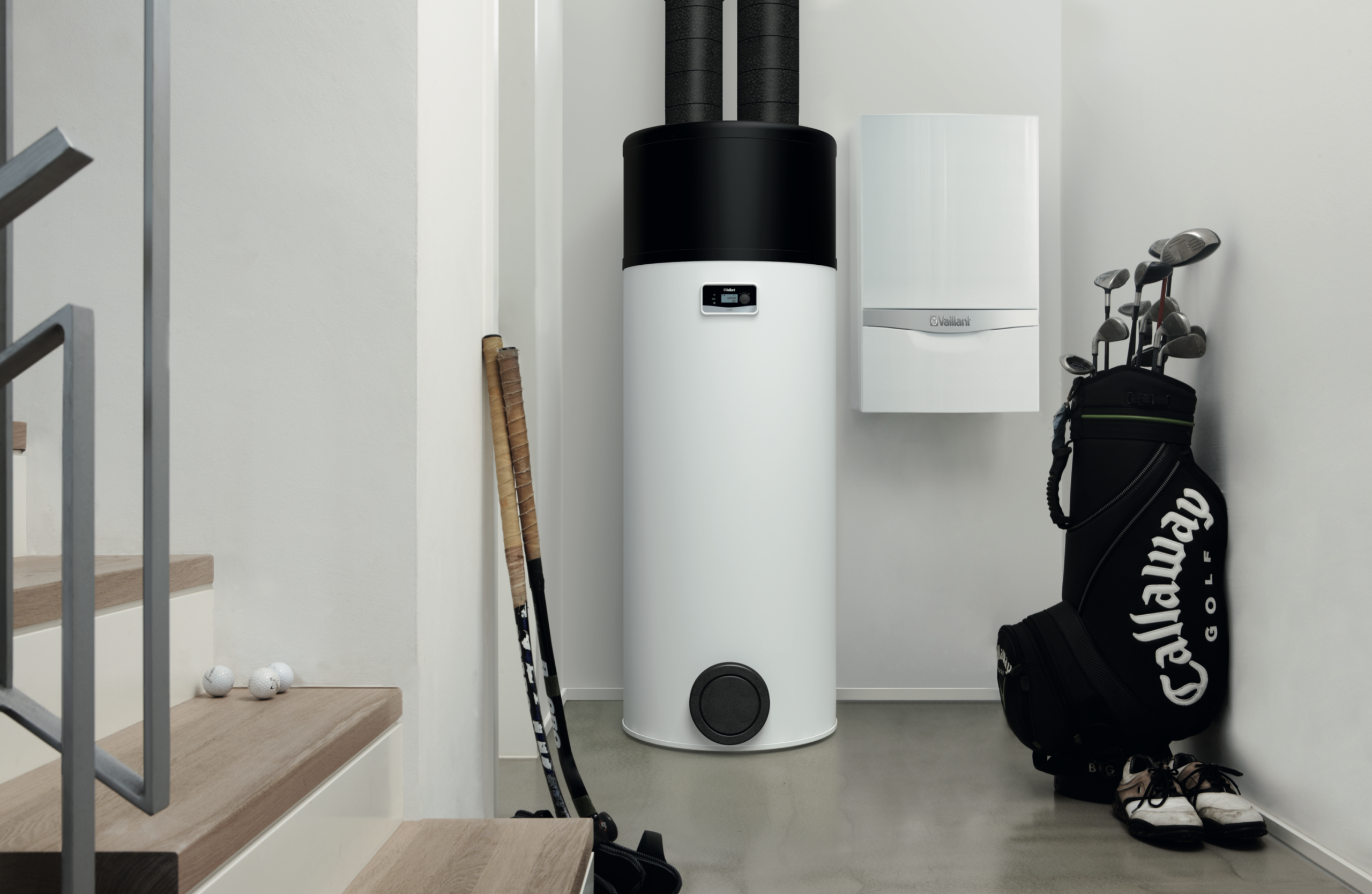 De transitie naar gasloos is in volle gang. Om ook voor de bereiding van warmtapwater niet meer afhankelijk te zijn van de gasketel, heeft Vaillant de warmtepompboiler aroSTOR ontwikkeld. “De installatie produceert warmtapwater uit vrij beschikbare energie in de vorm van binnenlucht óf buitenlucht,” legt Van der Winden uit. “aroSTOR is een individueel product waarbij boiler en warmtepomp zijn gecombineerd in één behuizing. Het is een kwestie van de binnenkomende waterleiding erop aansluiten, alsmede de warmwaterleidingen naar de badkamer, keuken, enz., de stekker erin en draaien maar. De aanvoer en afzuiging van de lucht verloopt via een concentrisch kanaal, vergelijkbaar aan de rookgasafvoer van de combiketel. Voor ‘gratis’ koeling zou je ook een bypass kunnen maken om de koele lucht in de zomer de woning in te blazen.”