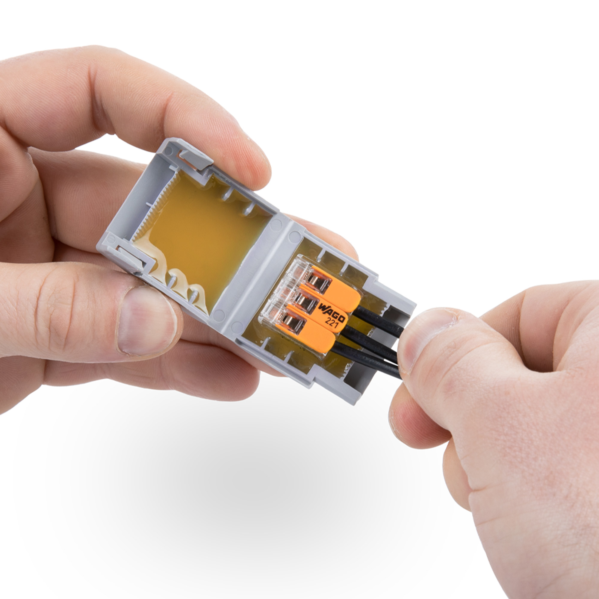 WAGO, de specialist voor verbindingstechniek uit het Duitse Minden, heeft de gelbox samen met echte experts op het gebied van vochtbescherming ontwikkeld – het bedrijf Cellpack. “Op het gebied van gietmateriaal geniet Cellpack een hoge reputatie, net zoals WAGO op het gebied van de verbindingstechniek. We zijn dan ook blij dat we deze gerenommeerde fabrikant als ontwikkelingspartner hebben kunnen winnen”, aldus Sebastian Heemeier, productmanager bij WAGO.