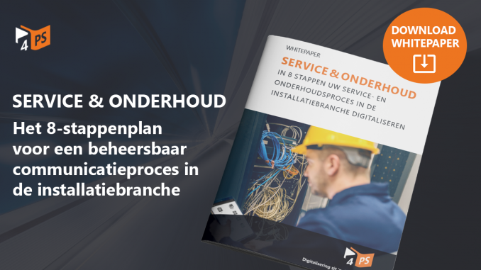 Meer weten over digitale oplossingen voor transparante en beheersbare communicatie in de ketensamenwerking? Download het whitepaper: ‘Service & Onderhoud: In 8 stappen uw service- en onderhoudsproces in de installatiebranche digitaliseren’. In dit whitepaper leest u verschillende tips & tricks over het digitaliseren van uw service- en onderhoudsproces.