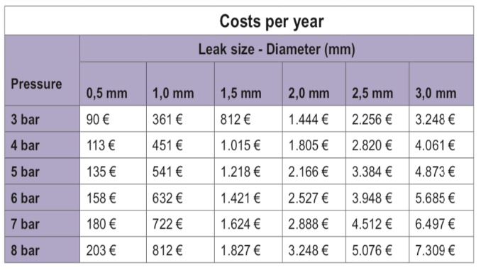 “Elke lekkage in het systeem genereert een ultrasoon geluid, dat niet hoorbaar is voor het menselijk oor, maar wel op te sporen door middel van professionele lekkage-opsporingsapparatuur. Het ultrasone signaal wordt dan vertaald naar een rapportage waaruit duidelijk blijkt hoe groot de lekkage is en hoeveel geld dit daadwerkelijk kost,” aldus Arthur. “Onze industriële afnemers staan vaak verbaasd van de hoeveelheid lucht die als gevolg van de vele haspels en koppelingen verloren gaat in hun fabriek. Het gaat immers zelden over één lekkage. Zeker in grote, oudere fabrieken kom je bij wijze van spreken om de 3 meter een lekkage tegen. Bij een nieuwe fabriek, waar alles volgens de laatste normen geïnstalleerd is, ligt dat net wat anders. Maar ook daar stromen letterlijk euro’s weg, zoals blijkt uit bovenstaande tabel.”