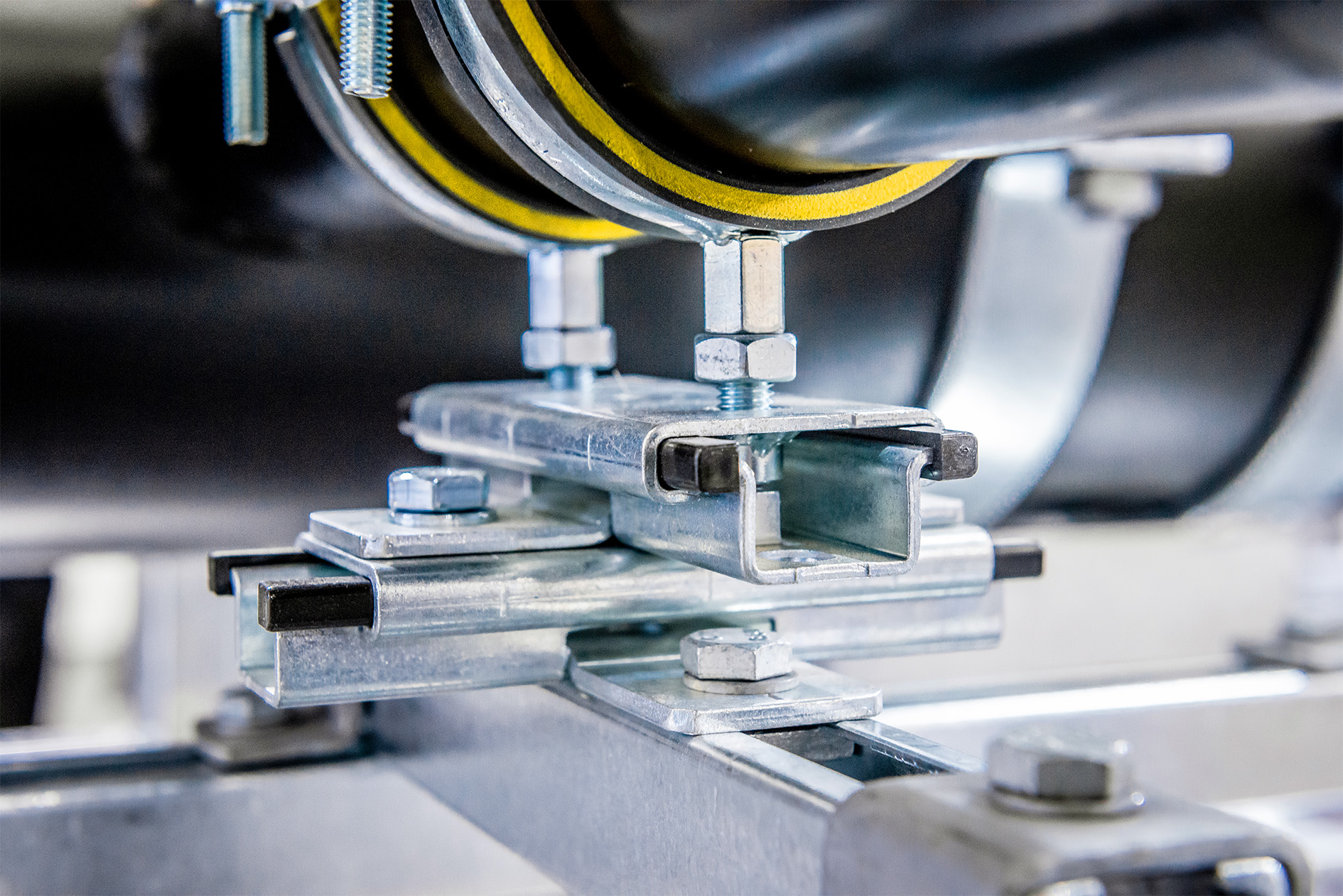 Een actueel thema in de leidingbevestigingstechniek is geluiddemping. “Geluidontkoppeling begint al bij de beugel,” zo maakt Edwin ons duidelijk. “Onze gepatenteerde inlegstrips in de buisklemmen hebben een geluidsniveau-verbetering van gemiddeld 22 dB(A). Ook kan deze zogenaamde dämmgulast inlage een deel van de uitzetting opvangen. Daarnaast hebben we nog een compleet programma aan vastpunten die ook significant bijdragen aan de geluidontkoppeling.”