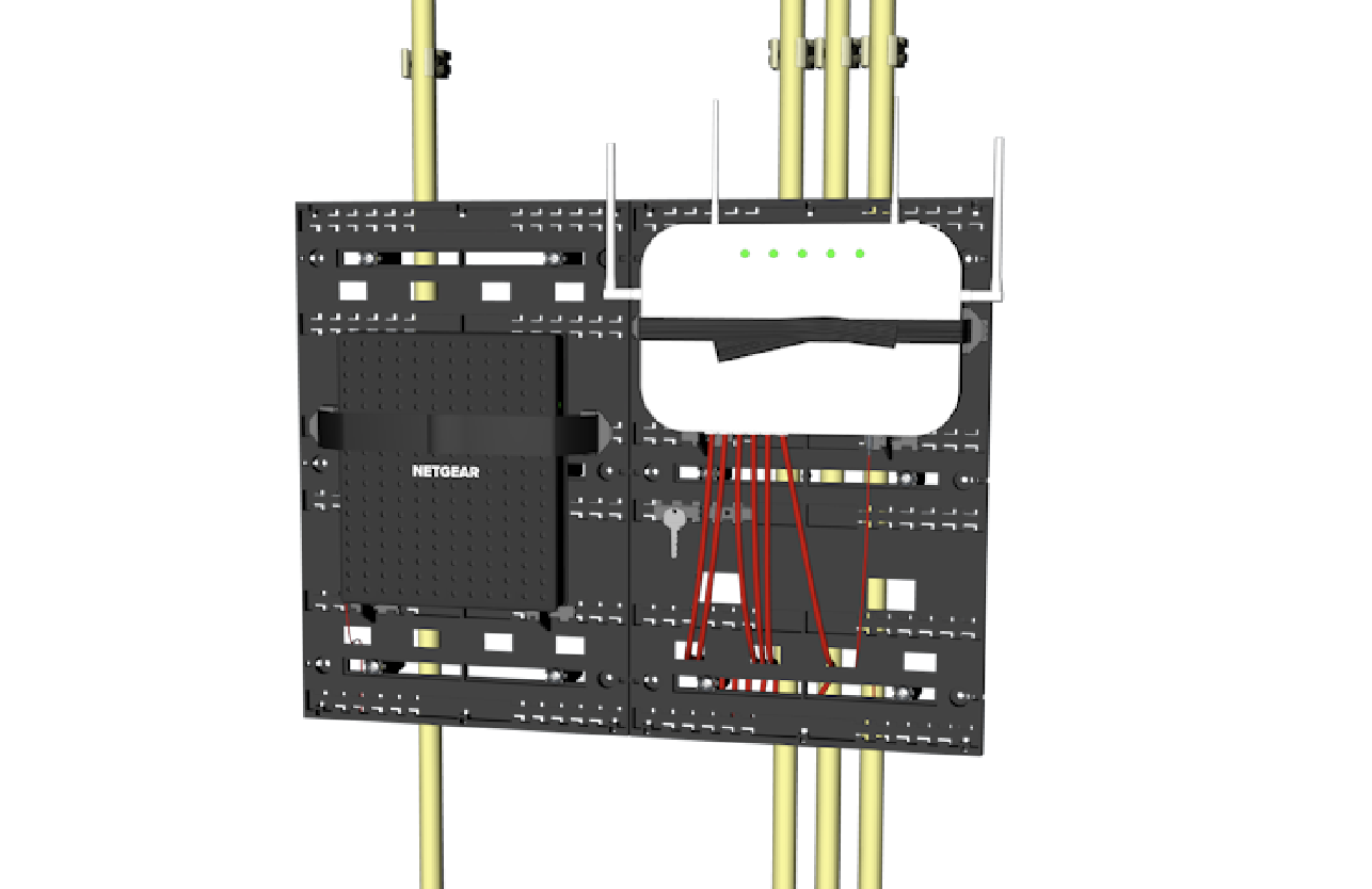 De montageplaat wordt met klembeugels aan de elektriciteitsbuizen bevestigd. “Je bouwt op die manier een extra ‘wand’ in de meterkast,” legt Nick uit. “Op de montageplaat kan allerhande apparatuur worden bevestigd via verschillende houders, voetjes, klittenband, enz. die we meeleveren. De montageplaat is aan alle zijden koppelbaar en uit te breiden naar gelang de apparatuur die je kwijt moet in de meterkast. De bedrading van alle apparatuur wordt mooi achter de montageplaat weggewerkt, dat zorgt voor een gestructureerde en opgeruimde meterkast.”