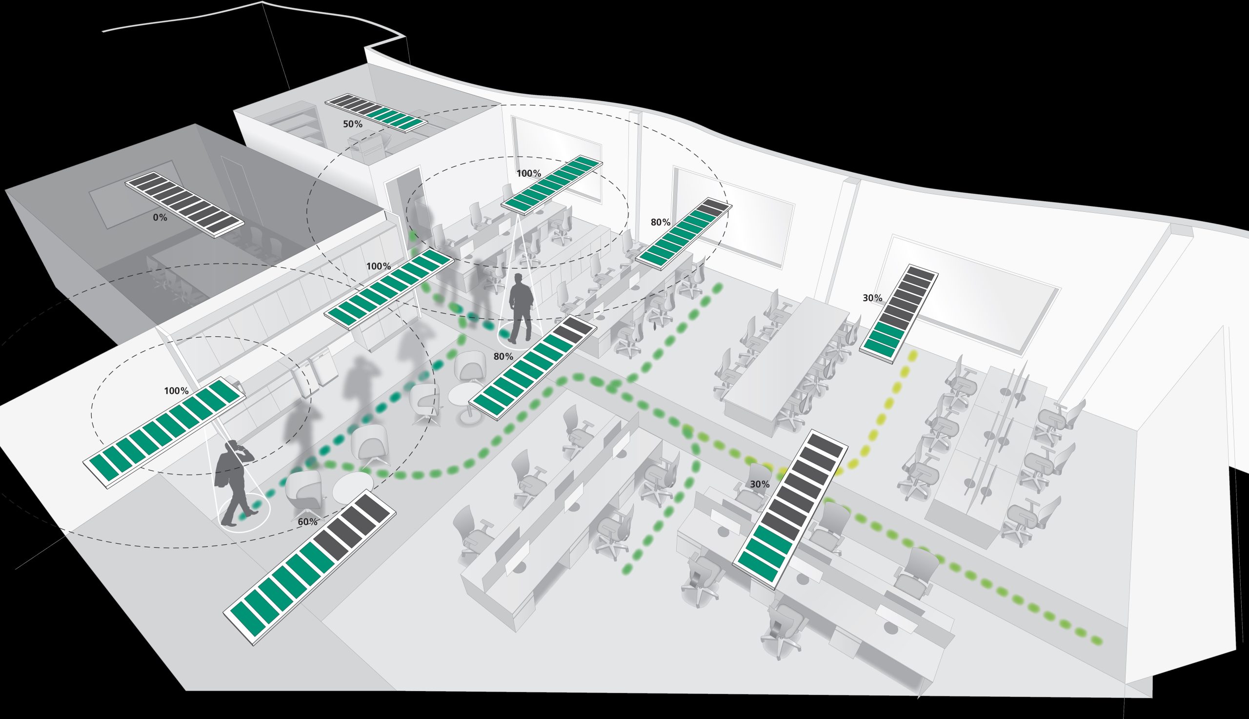 Door armaturen te voorzien van sensoren, ontstaat er een zee aan mogelijkheden. Als voorbeeld noemt John Knapen ‘heatmapping’, waarbij sensoren detecteren wanneer een bepaalde ruimte gebruikt wordt en welke werkplekken bezet zijn. “Voor een facility manager is dat essentiële informatie. Bijvoorbeeld bij de inrichting van een gebouw of bij het bepalen welke ruimtes wanneer moeten worden schoongemaakt. Ook de warmtehuishouding kan hieraan gekoppeld worden. Als er niemand aanwezig is, gaat de verwarming automatisch een graadje lager.”