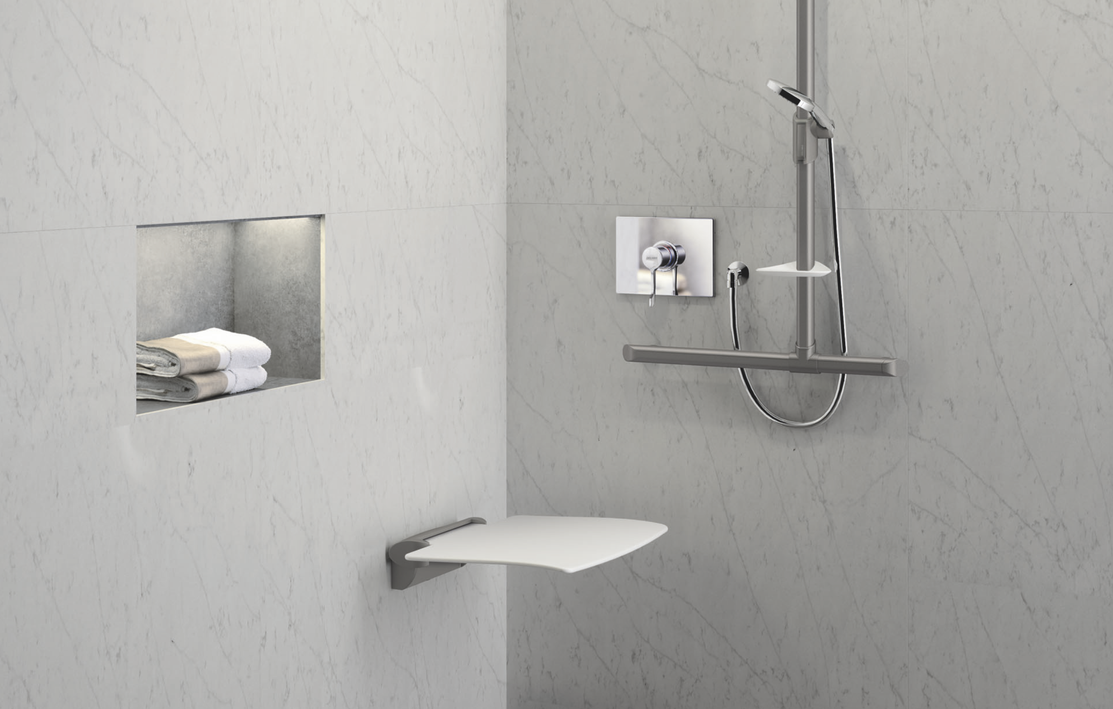 De aluminium grepen zijn gemakkelijk te reinigen en beschikken over een ergonomische platte anti-roterende voorzijde. De T-vormige douchestang werd trouwens ook bekroond met de Trophée du Négoce 2018 in de categorie Toegankelijkheid voor zijn functionaliteit en aantrekkelijk design. In neergeklapte positie biedt het opklapbare douchezitje (Laureaat van de wedstrijd ‘Salles de Bains Remarquables 2019’) een zitplaats met comfortabele afmetingen, terwijl de strakke lijnen zorgen voor een discrete uitstraling. Zo kan het zitje, eenmaal in verticale positie, integreren in de omgeving. Met een eenvoudige beweging kan het douchezitje vervangen worden door een douchetablet: in bijvoorbeeld een hotel of ziekenhuis is dit praktisch wanneer een snelle verandering nodig is.