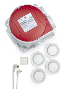 Het installatiepakket is zo ontwikkeld dat je alle materialen die nodig zijn voor de installatie in een doos bij elkaar hebt. Het pakket bevat 4 ventielen, een RFZ-schakelaar voor draadloze bediening van de Comfofan S en zowel een perilex als een randaarde stekker zodat de woonhuisventilator in alle situaties geïnstalleerd kan worden.